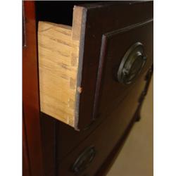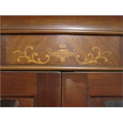 MAHOGANY HEPPLEWHITE STYLE SECRETAIRE with inlay. Made by Maddox Tables, Jamestown, NY. Inlaid urn decoration at top. Dovetailed drawers. Marked with label on reverse. 76" H, 33.5" W, 16.5" D