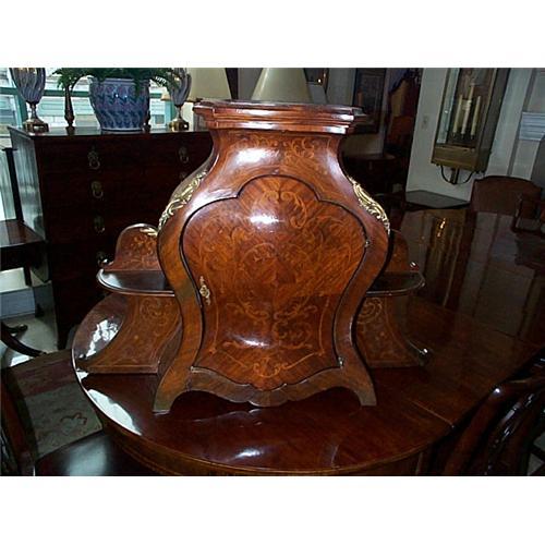 STUNNING EXAMPLE OF FRENCH LOUIS XV CABINET MAKING! DATING FROM CIRCA 1890, THIS BOMBAY FRONT MAHOGANY WALL CUPBOARD IS HEAVILY DECORATED WITH MARQUETRY AND INLAY AS IS THE STYLE OF LOUIS XV. EVEN THE SIDES AND TOP AND UNDERNEATH THE SHELVES ARE INLAID WITH MARQUETRY OF VARIOUS LIGHT AND DARK COLORED FRENCH WOODS. STANDS 25.5" TALL BY 36" LONG AND 7.5" DEEP. HOOKS HAVE BEEN ADDED TO THE BACK; ORIGINALLY IT PROBABLY SAT ON A COMMODE AND USED AS A VANITY CUPBOARD. NICELY DECORATED WITH BRASS ORNAMENTATION ON SIDES AND KEYHOLE...SORRY, KEY WAS NEVER FOUND WITH IT. CONDITION IS GREAT; ALL MARQUETRY, INLAY AND VENEER ARE INTACT. SOME LIGHT SCRATCHES ON THE WOOD, IT STILL MAINTAINS ITS ORIGINAL PATINA. INTERIOR HAS 2 SHELVES AS WELL.