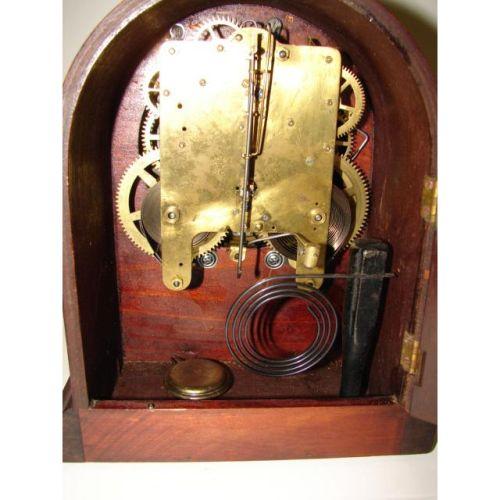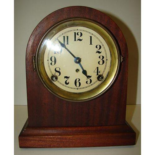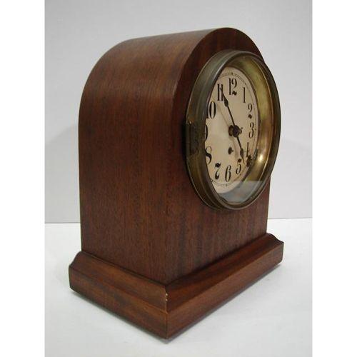 SETH THOMAS MAHOGANY MANTEL CLOCK. Dome top. Mahogany frame. Has pendulum. Works are marked “Made in U.S.A./ST”. 9.75” H