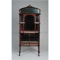 Lot 1256 MAHOGANY MIRROR BACK CURIO SHELF. Small size having multiple open shelves with central alcove decorated with carved lions having a large beveled edge mirror. Nicely carved backsplash has similar mirror as well as the bottom shelf. All is supported by four tall curving legs, which are extensions of shelf supports. SIZE: 62-1/2” h x 27-1/2” w x 13-1/2” d. CONDITION: Very good. 5-69373 (500-1,000)