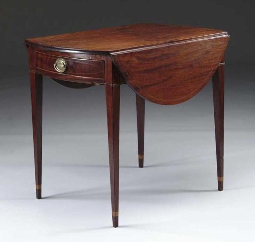 MAHOGANY ONE DRAWER FEDERAL PEMBROKE TABLE. The oval top with drop leaves has an inlaid string border, bow front drawer having similar inlay and oval bale brass hardware. The tapered legs have banded ankles with string inlay across drawer bottom and simulated drawer in back. PROVENANCE: From a fine Brunswick, Maine Estate. SIZE: 28-1/2” h x 32” d x 41-1/3” (open); 21” (closed). CONDITION: Hardware does not match, one leaf has old butterfly repair. Top has some ring stains and scarring but generally good. 9-27492