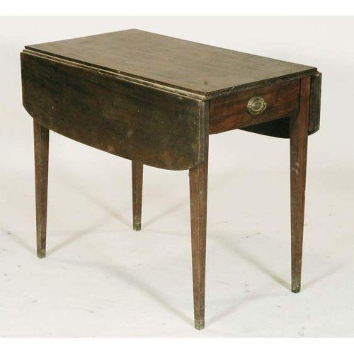 MAHOGANY PEMBROKE TABLE 33"x28"x20" early 19th century, CONDITION REPORT: back side of skirting with 50% veneer loss, fading, pen marks, rings and stains.