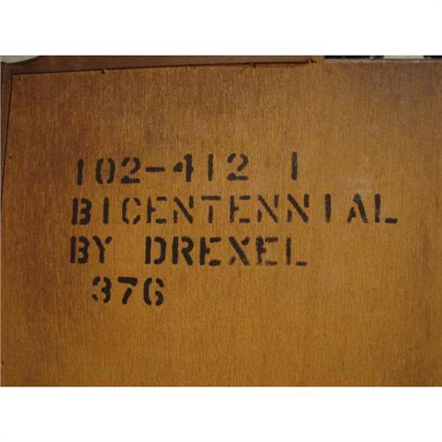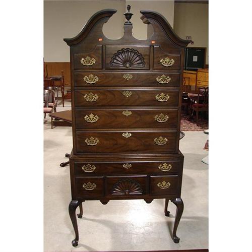DREXEL FURNITURE COMPANY BICENNTENNIAL MAHOGANY QUEEN ANNE STYLE TWO PIECE HIGHBOY. Has broken arch top with finial with shell carving at top center drawer and at bottom center drawer at base. Three drawers over four graduated drawers at top. Single drawer over three drawers at base. Missing part of back foot. Marked at back. 86” H, 40” W, 19.5” D