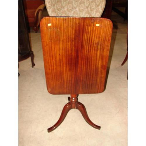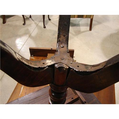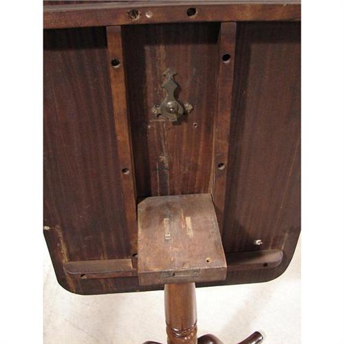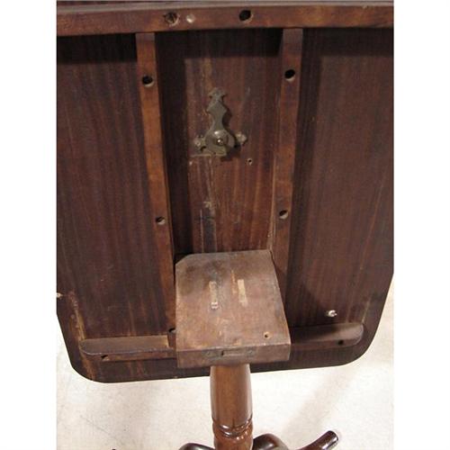 MAHOGANY QUEEN ANNE TILT-TOP TABLE. Dovetailed base with wrought iron leg support and pad feet. 29” H, 20” x 27”