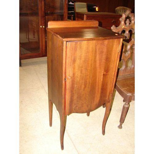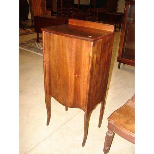MAHOGANY SHEET MUSIC CABINET. Has a splash back top and is on curved front legs. 41” H, 18.5” W, 14” D