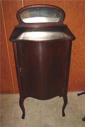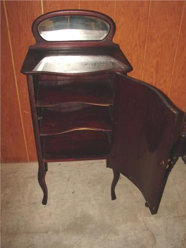 MAHOGANY SHEET MUSIC STAND. Has beveled mirrored splash back and bow front. 44.5” H, 18.5” W, 15” D