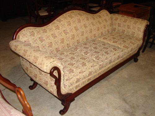 MAHOGANY DUNCAN PHYFE STYLE SOFA. Swan carved arms. Floral decorated upholstery shows signs of wear. 36” H to top of back, 77.5” L