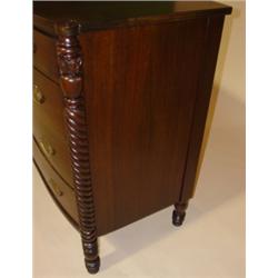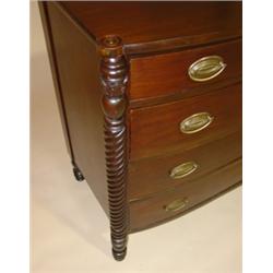 MAHOGANY SWELL FRONT 4 DRAWER CHEST. Reeded front legs. Cookie corner edges on front. Custom made. Dovetailed drawers. 38" H, 46.25" W, 20" D