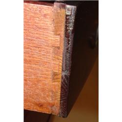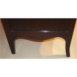 MAHOGANY THREE DRAWER CHEST. Swell front. Water staining and scratching to top of surface. Dovetailed drawers. 36" H, 44" W, 18.5" D