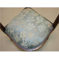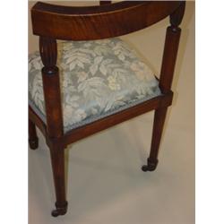 Mahogany upholstered corner chair on wheels. Has slight wear to wood. Upholstery is in good condition. 35.5" H to top of back, 22.5" W, 16" H to top of seat.
