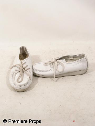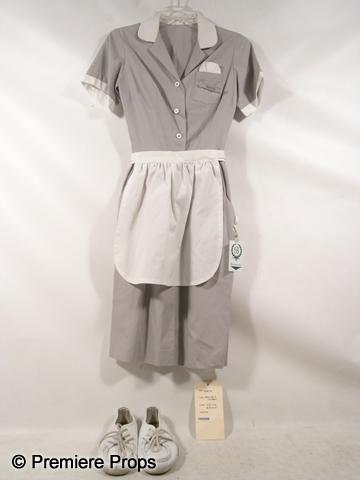 Maid in Manhattan (2002) - Marisa Ventura's (Jennifer Lopez) screen worn "maid" costume. Includes a grey poly/cotton short sleeve shirtwaist dress with eight buttons down the front, white rounded convertible collar and one foot white band around the sleeve, two off seam rounded pockets and one left pocket with one foot white pocket square maid uniform with sewn in white 'Beresford Hotel' key card, white small apron with gather and round edge and self pinafore bow tied, silver with 'Marisa' in black letters name tag with pin the back, and white lace up uniform "Cuddlies" shoes. Includes wardrobe tag.