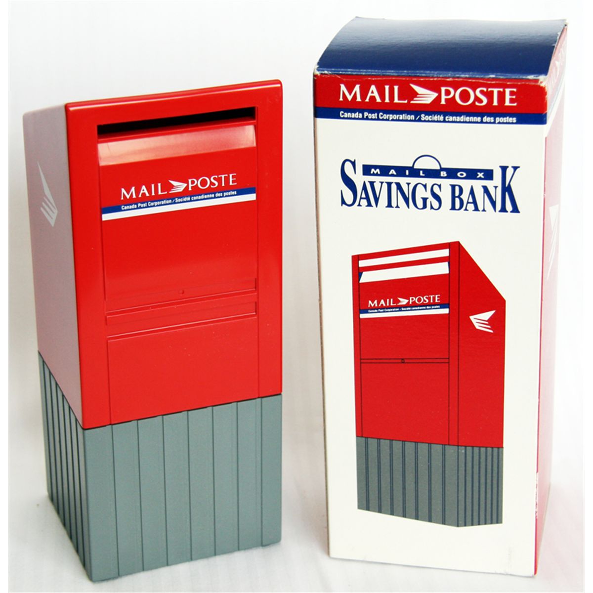 MAIL/POSTE. A Mail Box shaped bank. Coin slot in front of mail box. 9cm x 9cm x 21cm. Red and Gray plastic. Made in Canada. Box of issue included. New.