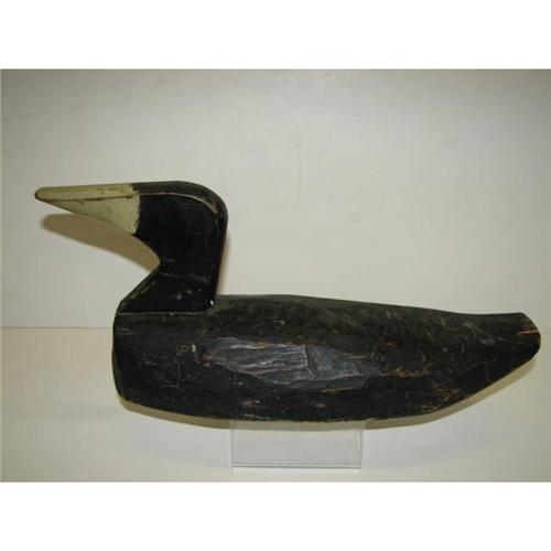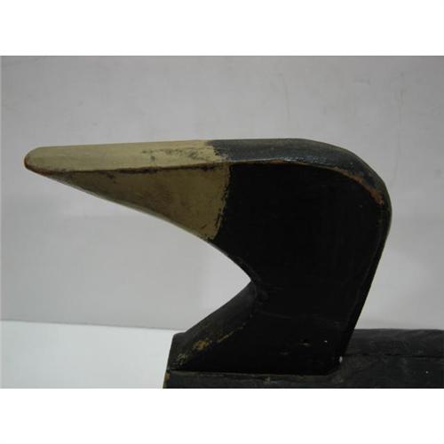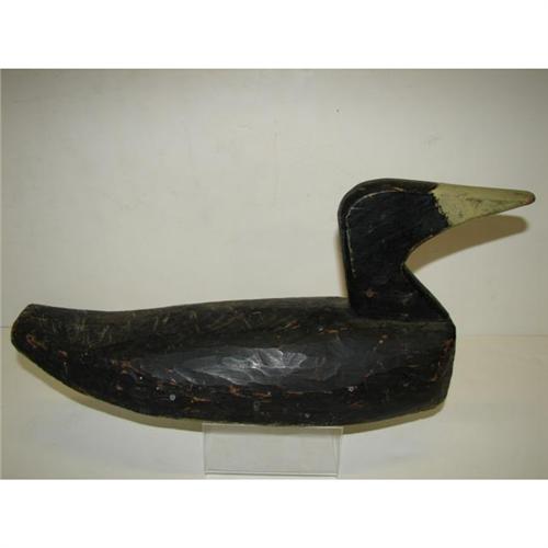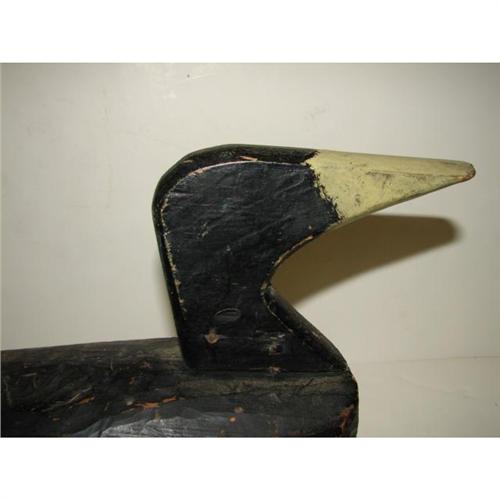 MAINE BLACK DUCK DECOY. Working repaint. Alert head re-attached. Split across back. 15” long.