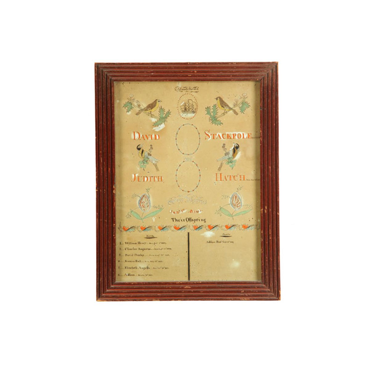 Watercolor on paper, executed before 1823. Birds, flowers and a ship decorate the record made for David Stackpole, Judith Hatch Stackpole, and their children. In a period frame, 17"h. 13"w.