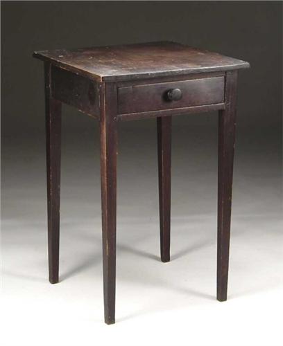 MAINE HEPPLEWHITE ONE DRAWER STAND. One board overhanging top with one drawer. Raised on square tapered legs. Late 18th/early 19th Century. SIZE: 28” h x top 18-1/4” sq. CONDITION: Generally very good. 9-26645