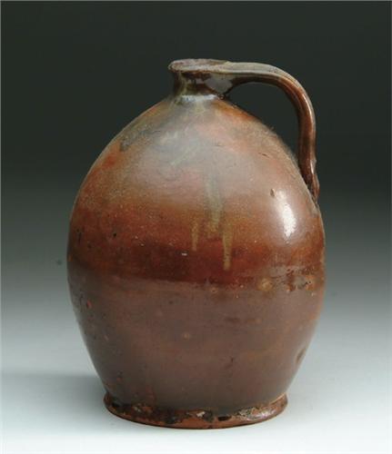 MAINE REDWARE HANDLED JUG. Has orange/brown with spot decoration glaze. PROVENANCE: From a Gardiner, Maine home. SIZE: 8-3/4in. h. CONDITION: Very good. 9-25989