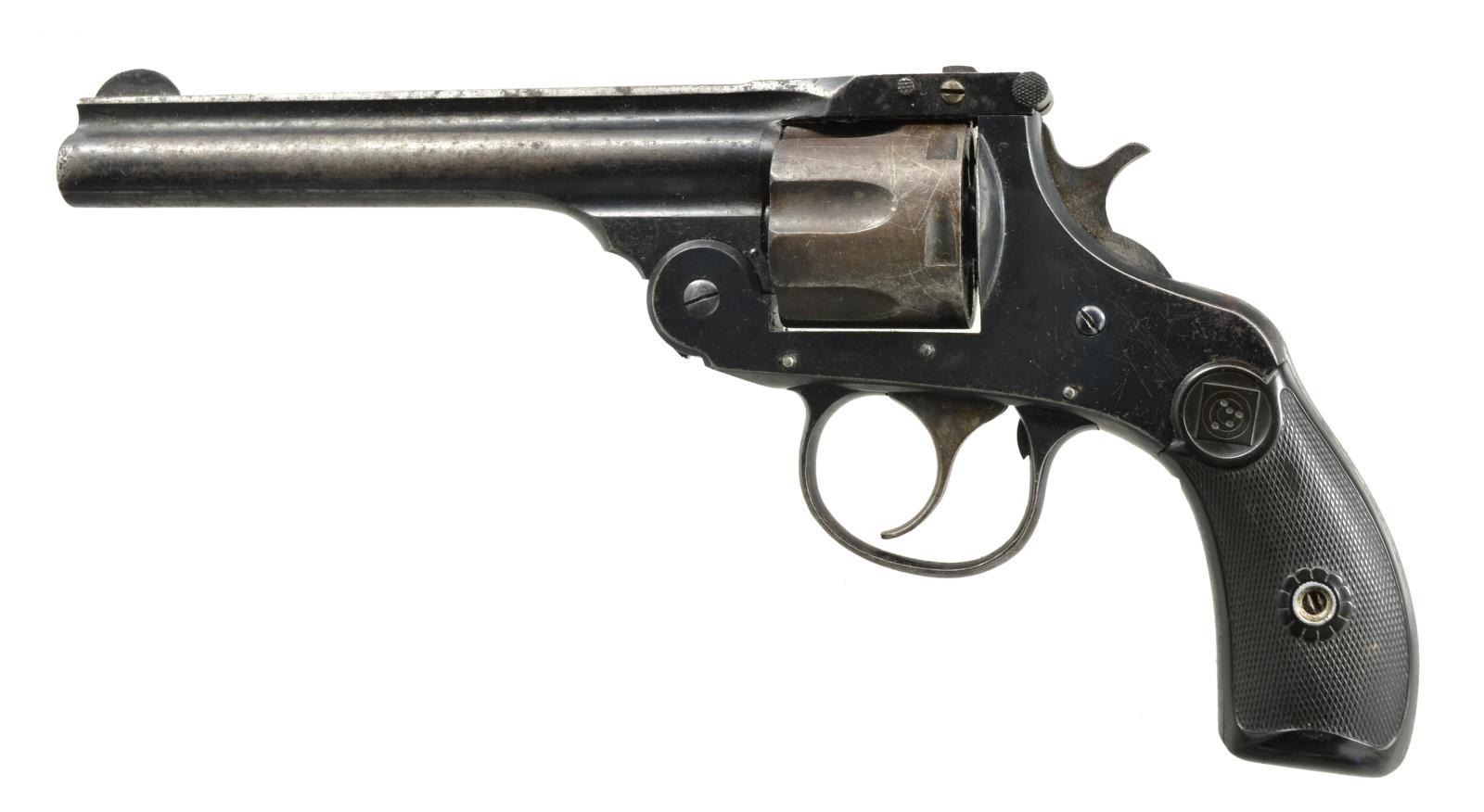 1) HARRINGTON & RICHARDSON TOP BREAK. Cal. 32 S&W. S# 198. Bbl. 5" w/ rib & semicircular front sight. 6 Shot fluted cyl. Top break DA only revolver. Blue finish. 2 Piece checkered hard rubber grips. CONDITION: 50% worn blue showing scattered pitting. Grips show wear w/ chip at bottom of right panel. Action is not in time. Pitted bore. (20-2379/DS). 2) MAINE STATE POLICE COLT OFFICIAL POLICE. Cal. 38 Spl. S# 554574. Bbl. 6" w/ integral semicircular front sight. 6 Shot long flute cyl. Blue finished. 2 Piece checkered walnut grips w/ Rampant Colt medallions. Back strap is marked "Me. S.P. No. 66,". CONDITION: 70% dull worn blue w/ scattered spots of pitting. Grips show heavy wear & worn checkering. Trigger has hand added checkering. Sound action. Bore retains strong rifling. (20-2380/DS). 3) HOPKINS & ALLEN SAFETY POLICE. Cal. 38 S&W. S# G1173. Bbl. 4" w/ rib & integral blade front sight having V notch rear sight. 5 Shot fluted cyl. Blued top break action. 2 Piece walnut grips. CONDITION: 40% dull fading blue w/ general surface rust & light pitting. Grips have lightly worn finish w/ handling marks. Sound action. Dark pitted bore. (20-2381/DS). ALL CURIO. $350-700.