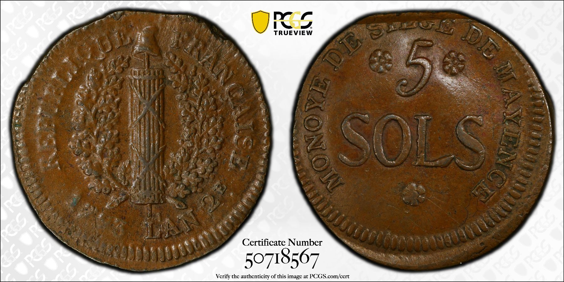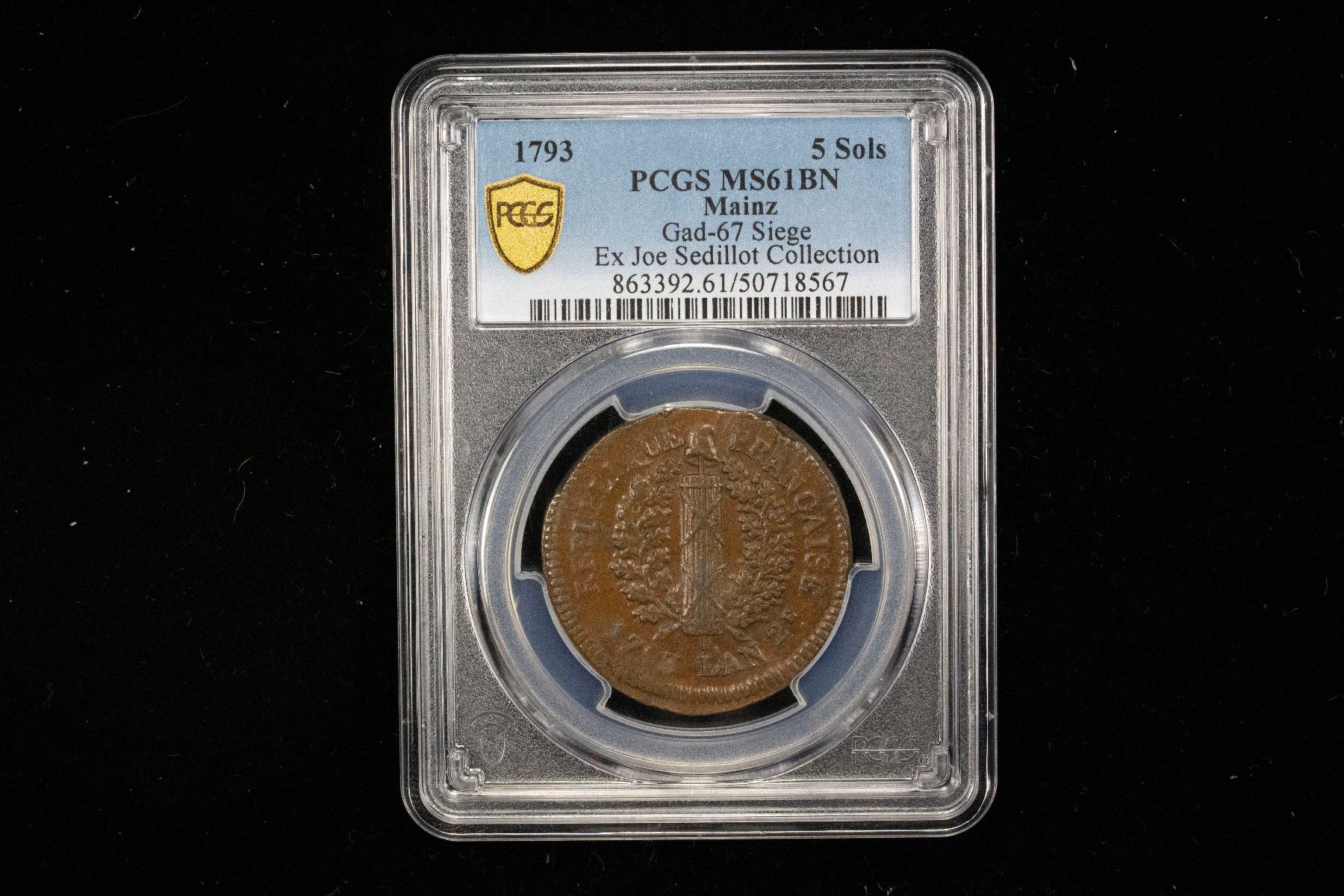 MAINZ: French Occupation, AE 5 sols, 1793 / L'An 2, KM-603, Gad-67, siege issue, hastily struck, a pleasant chocolate brown mint state example, PCGS graded MS61 BN, ex Joe Sedillot Collection. After a long siege in which much of the city was destroyed, Prussian and Austrian troops conquered the city on 22 July 1793, and the Jacobins were persecuted until 1795 when Mainz came under French control again.