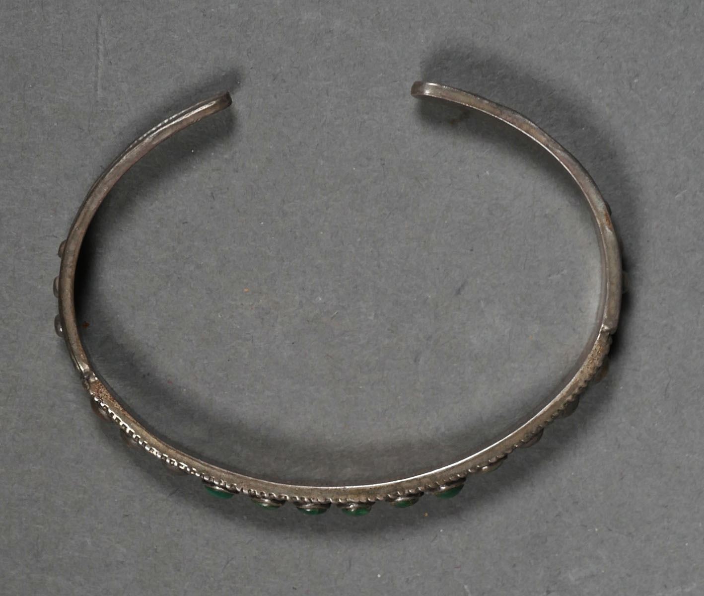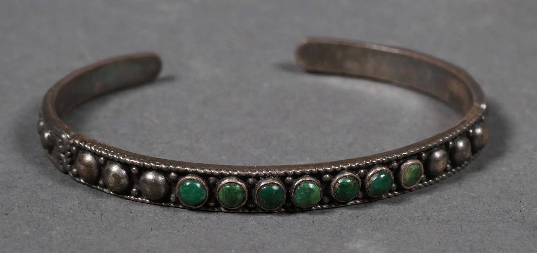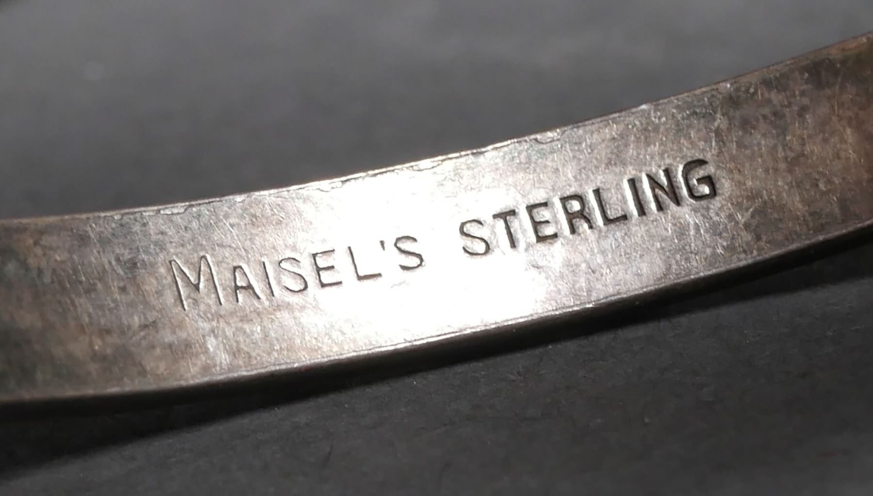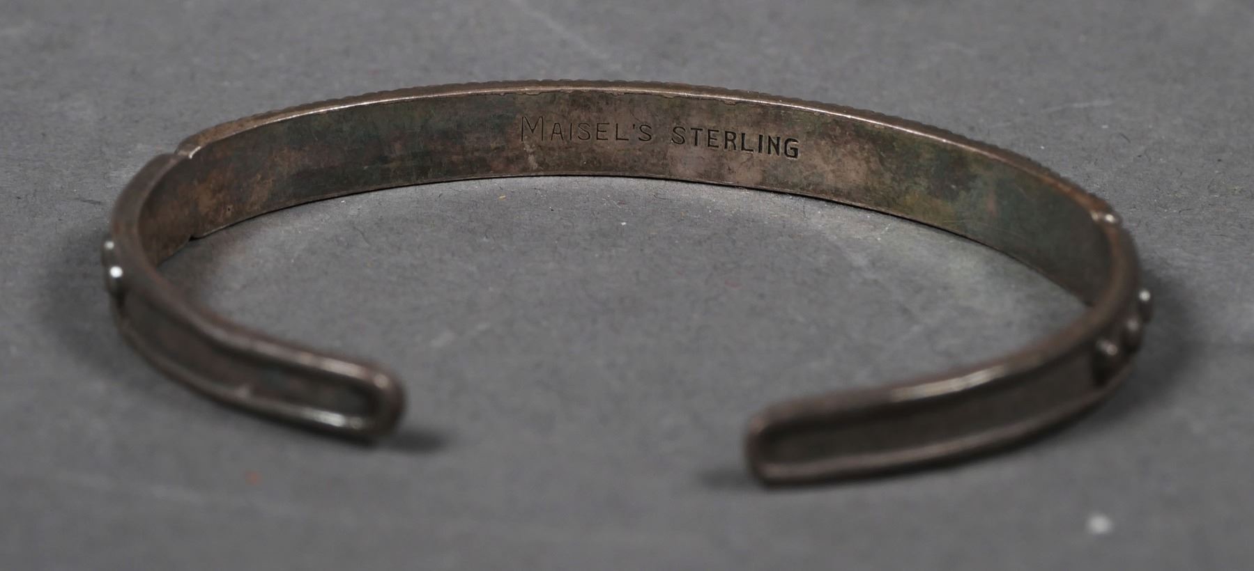 Southwestern Native American Indian silver & turquoise bracelet, signed Maisel's sterling. Total weight is 12.9 grams. 6" inside diameter with gap. Opening is approx. 3/4". No chips to the turquoise stones, bracelet has normal wear & tarnish.