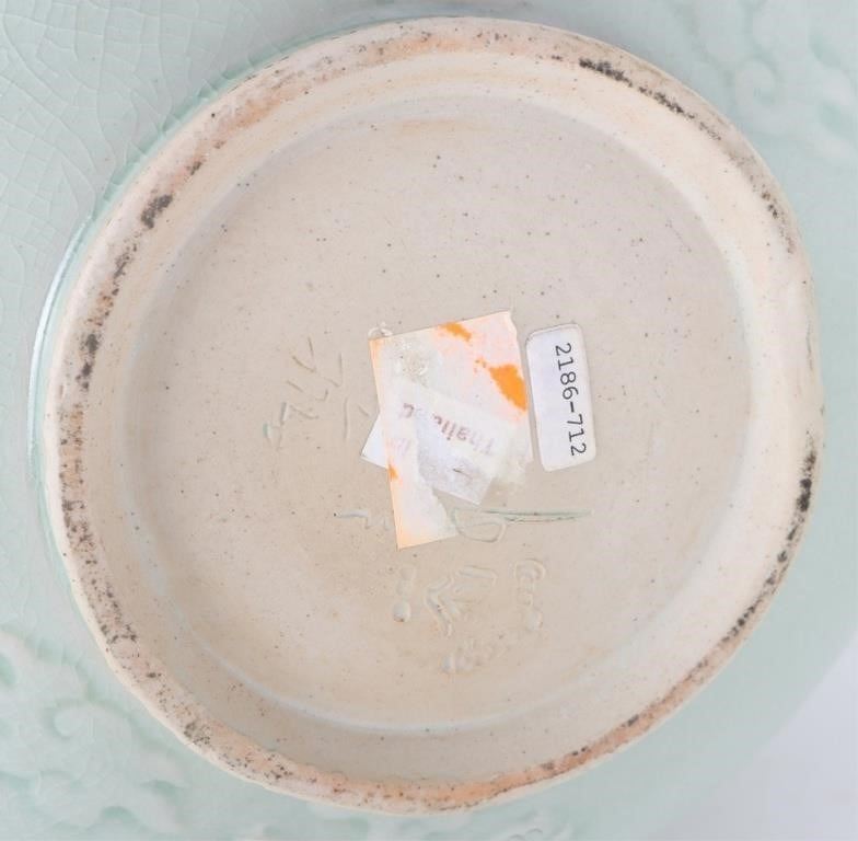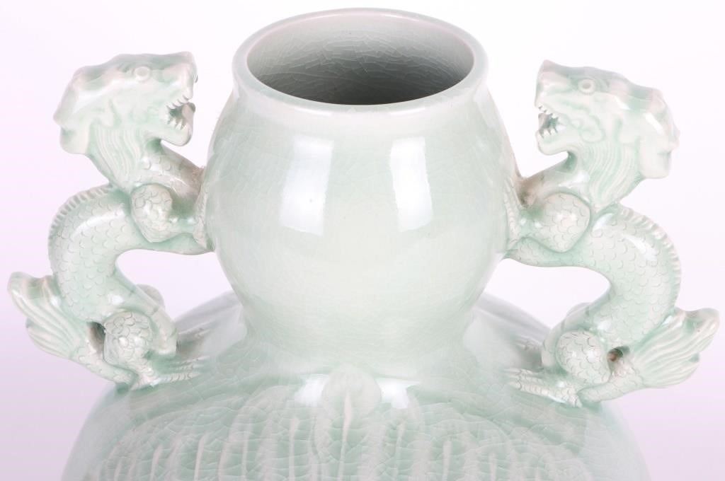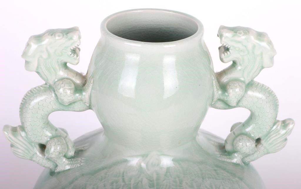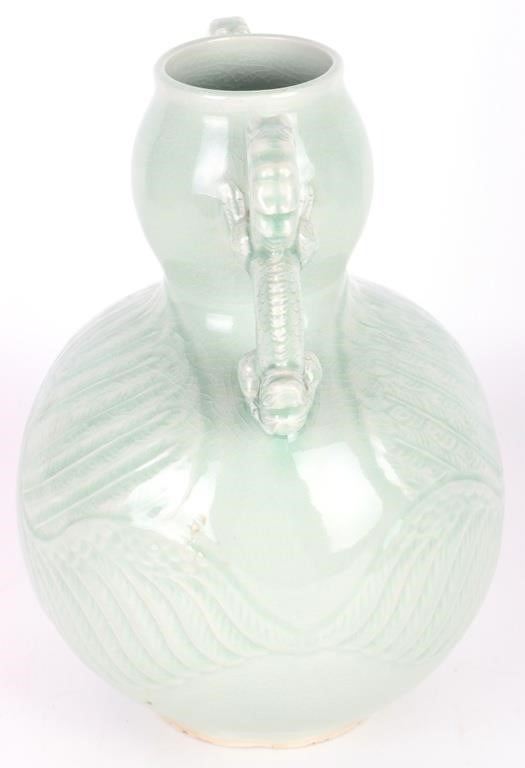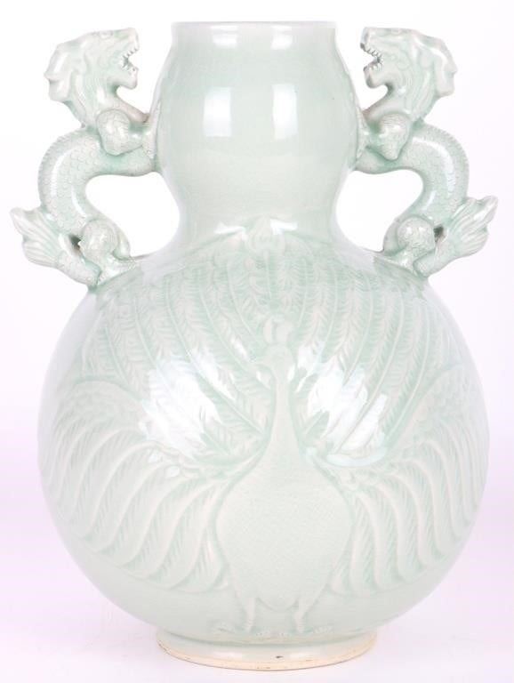 Maitland-Smith Peacock Celedon Dragon Handle Crackle Vase. This vase features a warm cream green crackle vase with intricate designs of a peacock and dragon handles.
