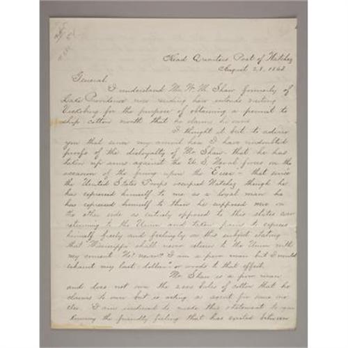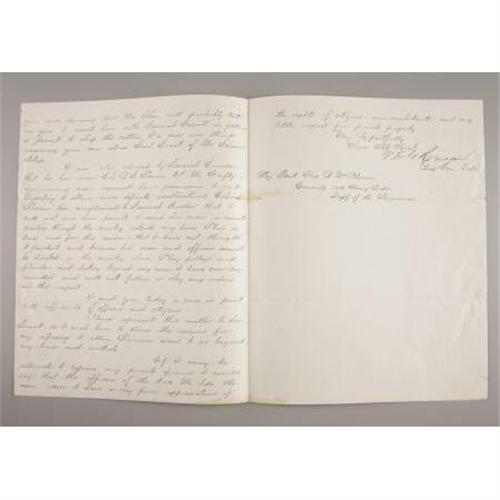 <B>MAJOR GENERAL THOMAS E. G. RANSOM LETTER SIGNED, 1863.</B></I> Three pages, 8” x 10”, Head Quarters Post of Natchez, August 28, 1863. Highly lauded by Grant, who commented of him: "He has always proved himself the best man I had to send on expeditions." <I> </B></I>This manuscript letter to Gen. J. B. McPherson, commanding the Army of the Tennessee. Ransom reports on alleged disloyalties, W. M. Shaw, and makes a bitter attack on Col. B. G. Farrar of the 30th Missouri. Letter in part: “...<I>his men and officers can not be trusted in the country alone. They pillage and plunder and destroy beyond any men I have ever commanded and will not follow or obey my orders in this respect... the officers... seem to have a very poor appreciation of the rights of citizens - non combatants - and very little respect for private property...” </B></I>Great content letter. <BR><BR><BR><B>Condition:</B></I> Very fine, light water stain on one fold <BR><BR><b>Shipping:</b> Flat Material, Small (<a target="_blank" href="http://www.heritageauctions.com/common/shipping.php">view shipping information</a>)