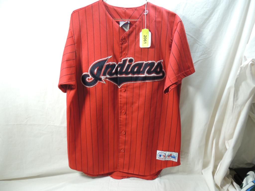 MAJESTIC CLEVELAND INDIANS JERSEY. NO NUMBER. SIZE LARGE. AS SHOWN. SEE PHOTO FOR MORE DETAILS.