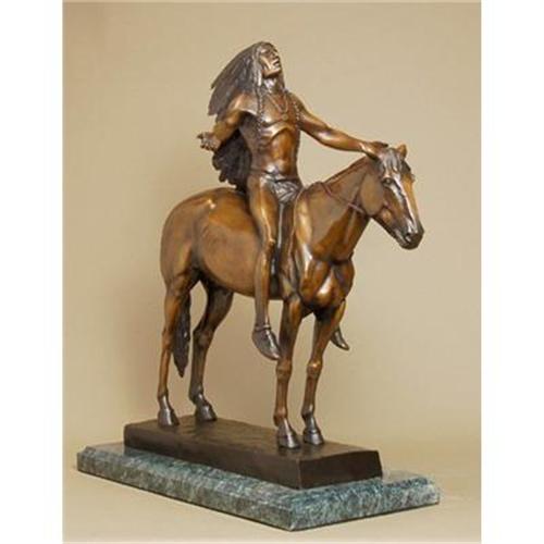 among the very best of Western-themed sculptures, this bronze by Edwin Dallin depicts the resignation of a Native American warrior at the end of the trail as he appeals for support to his god. Great Spirit has been cast of the finest pure bronze by the talented artisans, and is finished with a deep, rich patina applied under very high heat so that it has permanently fused with the metal. You will not find a better rendition of this iconic Western bronze than this one. This sculpture is mounted onto a marble base, and stands 20.5 tall by 21 wide.