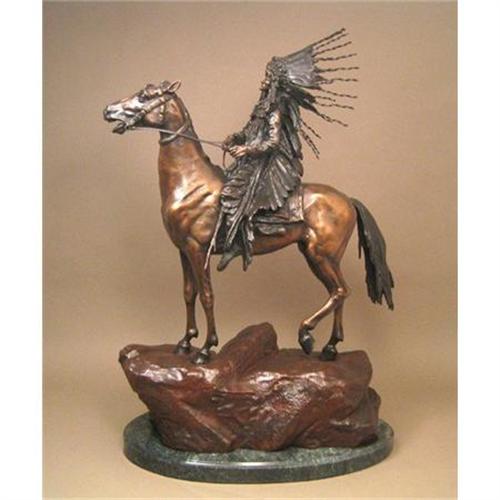 Indian Chief is mounted onto a marble base, and stands 28.5 tall by 19 wide. It is finished with a permanent patina fused into the bronze that enhances the beauty of the horse and the rocky landscape upon which it proudly stands. This sculpture is crafted by hand by our talented team of artisans using the very finest bronze, and will last for centuries.