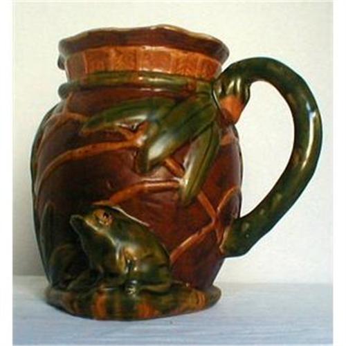 </font></strong>A fine example of English Art Nouveau in a rich Rockingham type glazed MAJOLICA PITCHER on yelloware (Barbotine raised details). Exceptionally nice color palette and a delightful frog amongst the lily pads.<p> A beautiful English Victorian statement that is in exceptional condition and displays beautifully. The pitcher is marked with an impressed 5 and signed.<p> Dimensions: 7.5 inches Height<p> 5.5 inches Width<p> Condition: Excellent, No hairlines or frits. A small glaze bubble on rim.</font>