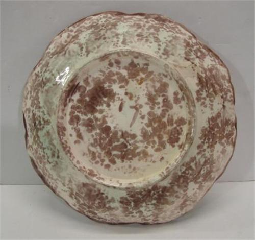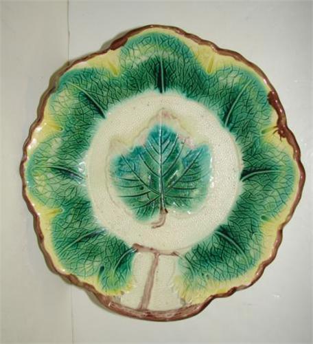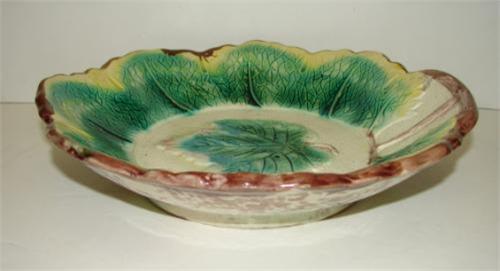 MAJOLICA BOWL. Relief leaf pattern at center and along sides. Shows signs of crazing. Shows two areas of loss to glaze at top of side. 2.25” H, 10” Dia.