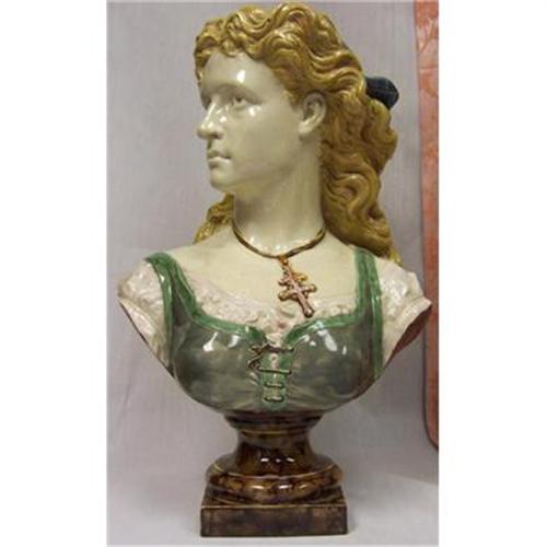 THIS IS A MOJOLICA BUST OF A VERY BEAUTIFUL BLONDE LADY. SHE HAS LONG BLONDE CULY HAIR AND IS WEARING A BLUE HAT. HER DRESS IS WHITE,GREEN AND GRAY. SHE IS ALSO WEARING A CREIFIX AROUND HER NECK.THE BOTTOM OF THE BUST IS A BROWNISH MOTTLED COLOR.SHE DOES HAVE SOME DAMAGE AROUND THE BASE AND IN HER HAIR. IT IS SIGNED BUT I CAN NOT MAKE IT OUT.THIS IS A WONDERFUL OLD BUST AND WOULD LOOK NICE ON YOUR SPECIAL TABLE.YOU MAJOLICA COLLECTOR'S OR BUST COLLECTOR'S CHECK HER OUT!!!