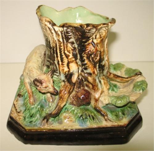 FIGURAL MAJOLICA CIGAR HOLDER. Decorated with tree stump, fox, & rabbit. Holds cigars, matches, & ashes. Unmarked. Slight chipping at bottom of base. 6” H