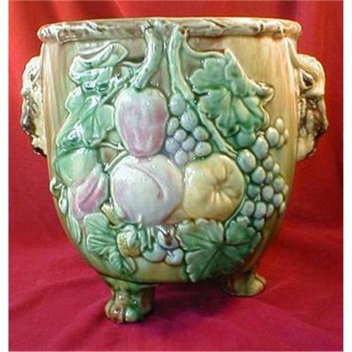 <p>Twig motif around top rim. Huge bunches of fruit including grapes, apples, plums, strawberries and cherries colored yellow, purple, pink and green. Different designs on front and back. On the sides of this pot, acting as handles, are goat heads. The body and the feet are glazed green, gold and brown all running together. The