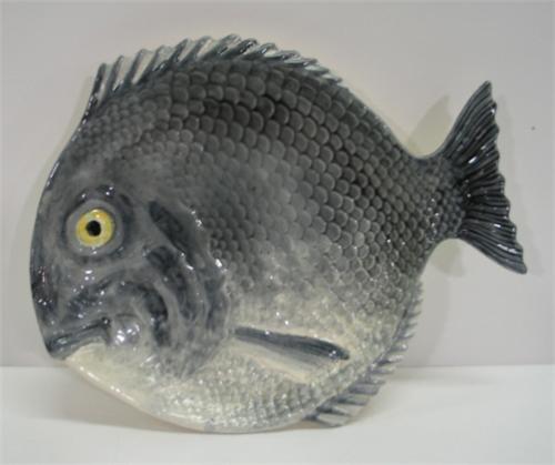 MAJOLICA FISH FORM PLATE. Marked with illegible embossed mark on reverse. Possibly Etruscan. 10.75” L