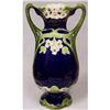 THIS IS A WONDERFUL OLD MAJOLICA FLOWER VASE.IT IS ALMOST ALL DARK BLUE, WITH BEAUTIFUL VIOLET LIKE FLOWERS ON THE BOTTOM, MIDDLE AND TOP. THE FLOWER STEMS ARE WHAT THE HANDLES OF THE VASE ARE.THEIR IS ONE 1/16 TINY CHIP ON THE TOP OF THE VASE AND ONE CRACK IN THE HANDLE.THIS IS A VERY BEAUTIFUL VASE. YOU VASE OR MAJOLICA COLLECTOR'S CHECK THIS OUT!!!