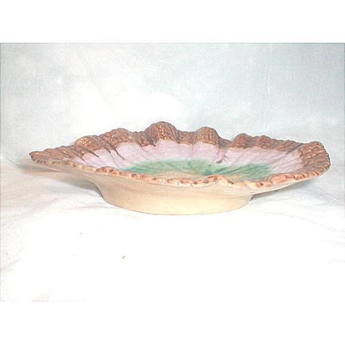 HERE IS A BEAUTIFUL MAJOLICA PIECE WITH SUCH LOVELY COLORS OF BROWN, PINK (WHICH IS ALMOST A LAVENDER SHADE), GREEN AND BEIGE. THIS DISH MEASURES 1 1/2 IN. TALL, 8 1/2 IN. IN LENGTH, AND 6 1/2 IN. WIDE AND IS IN VERY GOOD CONDITION WITH NO CHIPS, CRACKS, OR REPAIRS.