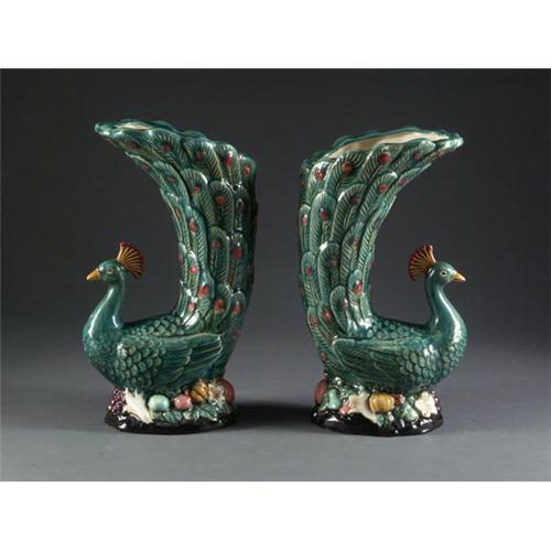 MAJOLICA VASES: A matching pair of attractive and unusual shaped glazed peacock majolica vases, being in the shape of a sitting winged peacock surrounded with fauna and fruits having the tail portion rising into a round then oblong shaped vase form and in the having an overall design of layered feathers, 15 «'' H x 8 «'' at the widest point. The colors are primarily aqua green with pink accents. The vase, as is often common with Majolica, is unattributed but design would indicate continental and late 20th century. Note: Surface crazing and a few minor flea bites around the bottom, no repairs noted.