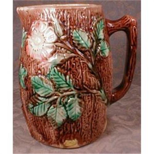 Beautiful majolica pitcher in very good to excellent condition. Holdcroft style tree trunk pitcher with roses or what we are calling a woodland rose pattern.