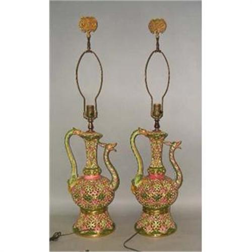 CANTAGALLI signed majolica is treasured among collectors. This outstanding large pair of reticulated porcelain lamps has all the desireable details so sought by this wonderful Italian Majolica manufacturer.<p> From the top of the incredible gilt finials to the serpents and figural heads these lamps just jumpout. Bold majolica is contrasting greens and pinks really set off a RETRO feel, with age old Italian Majolica.<p> The lamps are signed with the Cantagalli name, rooster and Italy.<p> Dimensions: To be added (very large)