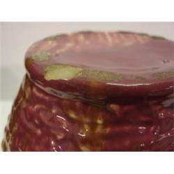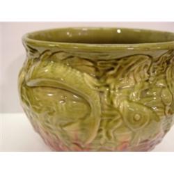 MAJOLICA STYLE ART POTTERY FLOWER POT. Relief decorated with fish around body. Several small chips on bottom. 8.5" H, 8.5" Dia.