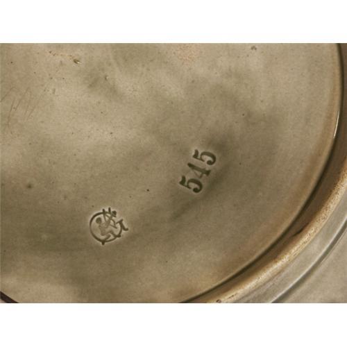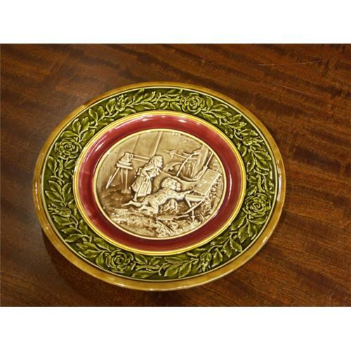 POTTERY: A round glazed Majolica type hanging wall plate having a brown lip against a raised green floral wreath ring followed by a maroon undecorated ring which surrounds the center containing a European style domestic kitchen scene with children. The hallmarked was not identified, circa 20th century. 12 ¼'' D. Note: no chips or damage noted.