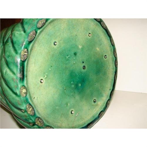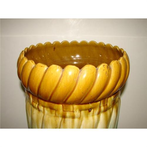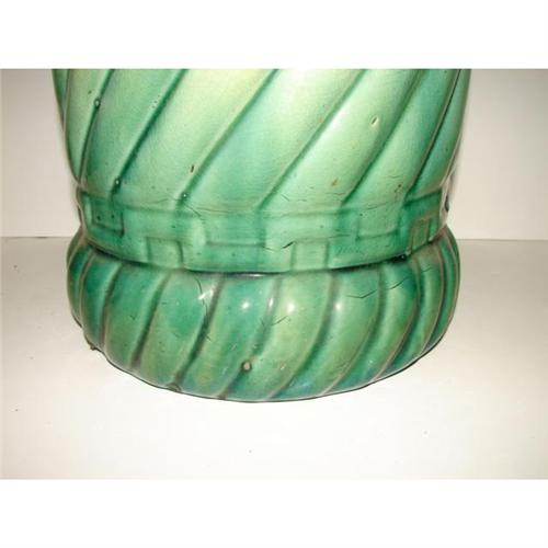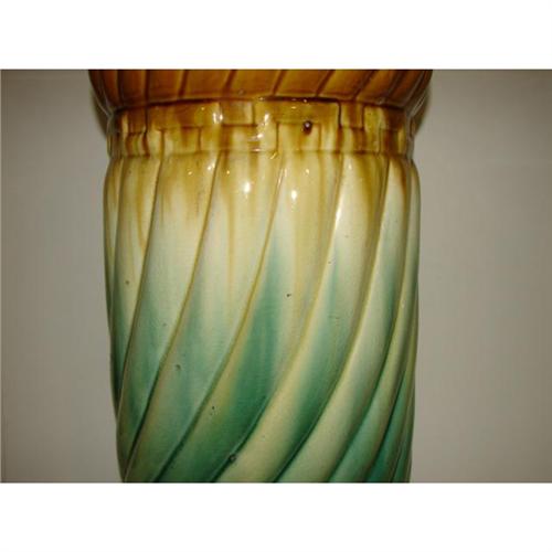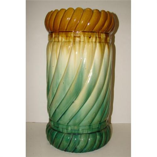 MAJOLICA STYLE POTTERY UMBRELLA HOLDER. Relief twisted panel decorated. Shows crazing to surface. No mark. 20” H