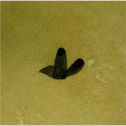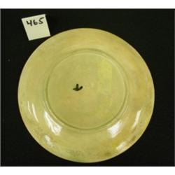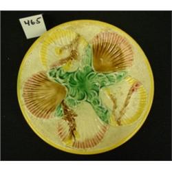 Majolica shell plate. Five shells around a green center. Yellow border. 7.5" in diameter. Artist mark on underside is a black bird under the glaze. Condition: Some roughness on edge and 1 glaze flaw on a shell. 1.5" hairline on underside.