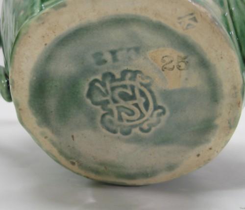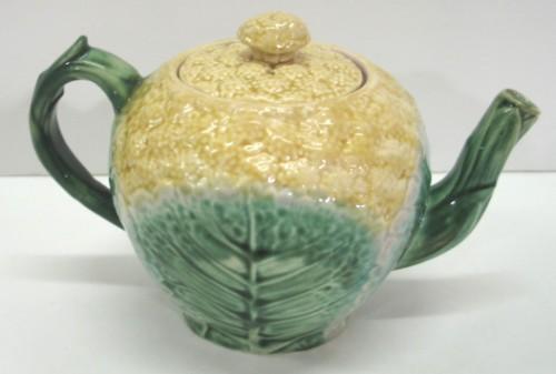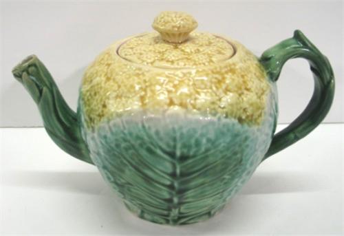 MAJOLICA ETRUSCAN CABBAGE LEAF DECORATED TEAPOT WITH LID. Griffen, Smith, & Hall (1878-1889). Marked on bottom. Slight crazing is visible throughout. 5” H