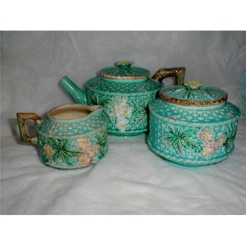 <tr><td>Title:MAJOLICA TURQUOISE BASKETWEAVE & FLORAL 3 PIECE</td></tr>