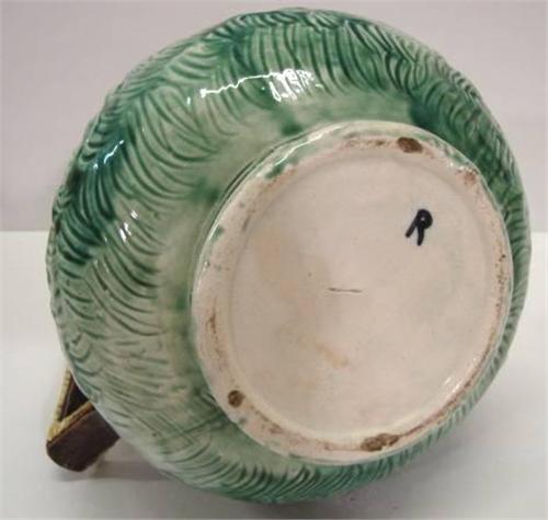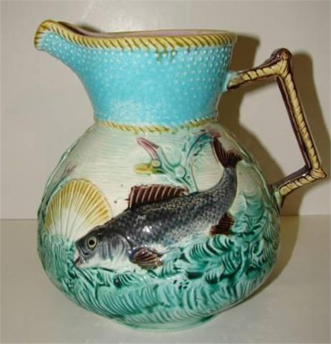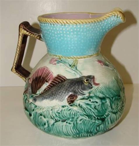 MAJOLICA WATER PITCHER WITH OVOID BODY. Has relief fish decoration at two areas on body. Unmarked. Shows signs of crazing throughout. 8.5" H