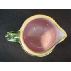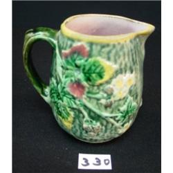 4 5/8" Tall & wide Wedgwood/Majolica Creamer in Blackberry pattern. Interior glazed pink, unmarked. Small chip on spout but otherwise good condition.