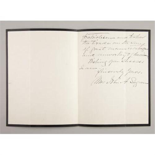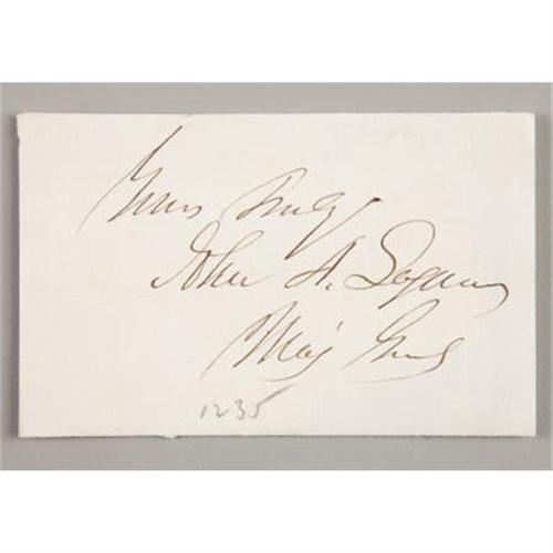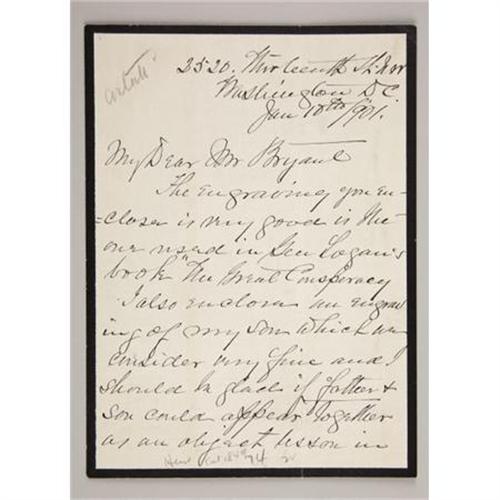 <B>MAJOR GENERAL JOHN A. LOGAN SIGNATURE WITH RANK AND MRS. JOHN A. LOGAN AUTOGRAPH LETTER SIGNED,1901.</B></I> "<I>Yours truly/ John A. Logan/ Maj Genl</B></I>" signed on a 3.75" x 2. 5" sheet, in ink. Logan was a distinguished Union general in the Civil War, receiving the Medal of Honor for action at Vicksburg. He later served as a Senator from Illinois and, in that capacity, was the main proponent behind creation of the Memorial Day holiday. Also in this lot is a hand written letter from Mrs. John A. Logan. Dated Jan. 10th, 1901. <I>“My Dear Mr. Bryant, the engraving you enclosed is very good is the one used in Gen. Logan’s book “The Great Consperacy”</B></I> sic <I>I also enclose an engraving of my son which we consider very fine and I should be glad if father & son could appear together as an object lesson in patriotism and to show the tirade on the sons of great men is outrageous and unworthy of American. Wishing you success I am sincerely yours, Mrs. John Logan.”</B></I> <BR><BR><B>Condition:</B></I> Both items in fine condition.<BR><BR><b>Shipping:</b> Flat Material, Small (<a target="_blank" href="http://www.heritageauctions.com/common/shipping.php">view shipping information</a>)