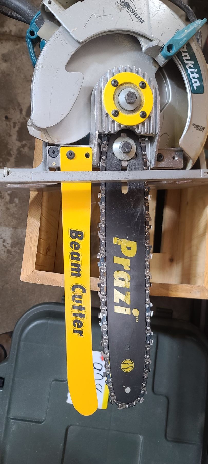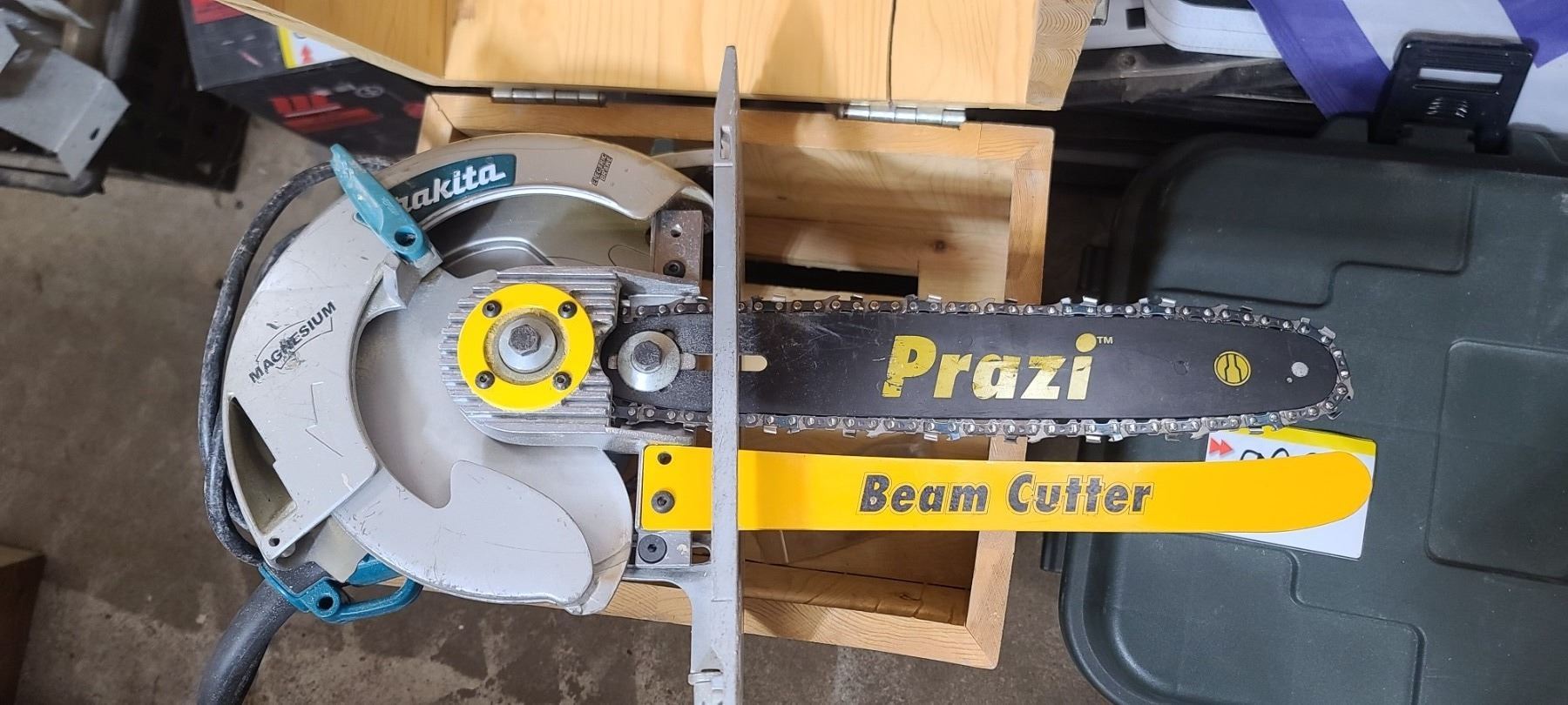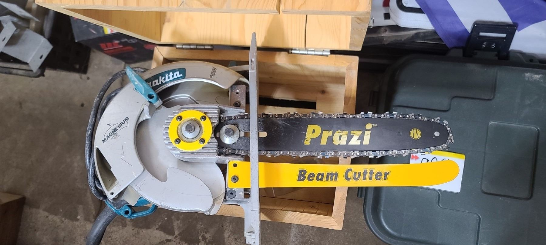 MAKITA MODEL 5008HGA SAW WITH PRAZI 12" BEAM CUTTER SAW ATTACHEMENT IN WOOD BOX