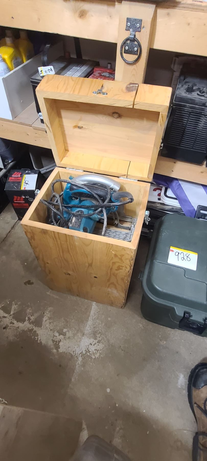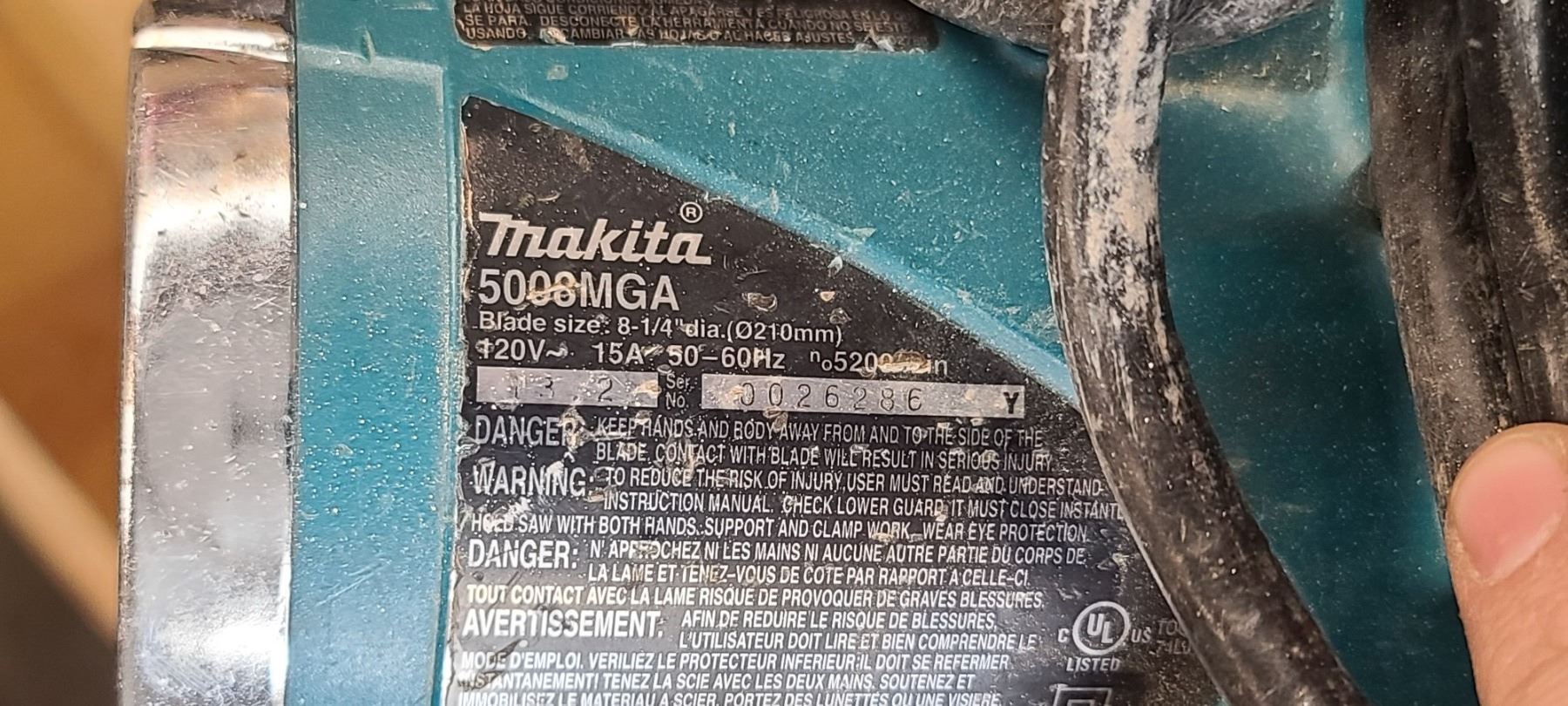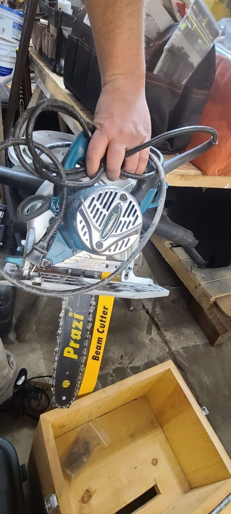 MAKITA MODEL 5008HGA SAW WITH PRAZI 12" BEAM CUTTER SAW ATTACHEMENT IN WOOD BOX